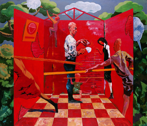 在画中把房子缩减到一个单独的最简单的符号时,实际上它代表的是人类生活的一个最基本的社会单位。我在符号化的房子里边安插了不同的人,表达了房子有的时候对人是一种限制,有的时候是一种保护,人需要房子作为依存的庇护所,同时又不断地想挣脱、突围。这时期的画与以前比,画面的颜色变单纯了,视觉的角度也不一样了,这个时候更贴近人的生活,进入到房子里面去了,由里向外看了,更以人类的自身角度看世界了。用房子的符号进行创作思考延续了较长时间,就因为房子跟人的关系是最平常也是最特殊的,里面有很多可以表达和象征的东西。