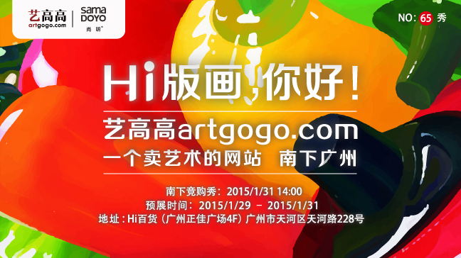 Hi!版画,你好! 艺高高artgogo.com南下广州 南下竞购秀:2015/1/31 14:00 预展时间:2015/1/29 – 2015/1/31 地点:Hi百货(广州正佳广场4F) 1.18周年大秀之后, 艺高高活力依旧,