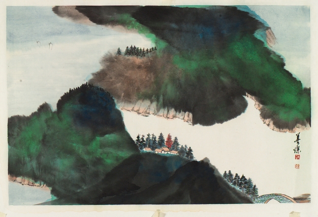 以大風堂張大千大師傳統的潑墨潑彩筆法畫成,,厚重的潑墨配上翠綠的山岩,襯托出藍天白雲,海灣、蒼崖、歸帆。在茂密的樹叢下,佈置著數間村屋,在不遠處的小橋流水,構成了一幅美麗的山水圖,人在畫中住,多麼愜意。2012年11月27日至12月5日曾在浙江美術館展出。