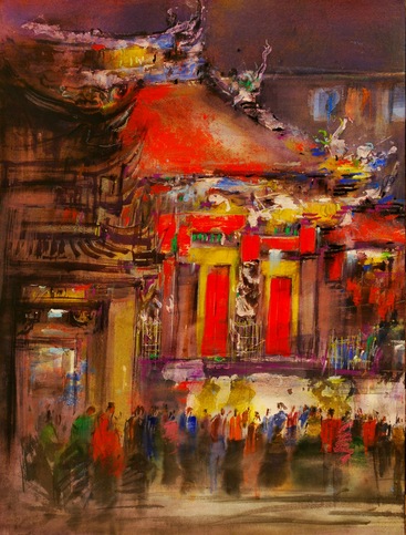 第九届行天宫人文奖美术创作比赛(2010全国征件)西画成人组-入选奖写画地点: 台湾台北行天宫媒材规格:硅酸钙板、厚工水彩那夜,参与行天宫“夜祭” 爱上夜灯下的宫殿建筑,在写实与写意间补捉眩光下的行天宫,庄严肃穆又祥和。