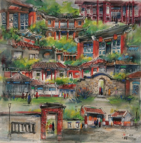 写画地点:台湾台北林家花园媒材规格:水彩第三届枋桥艺文奖(2009全国征件)绘画类-成人组-佳作座落于板桥市区的林本源园邸,园林在对称形式下发展的中国建筑,其推动力是儒家封建体系中的礼教精神,和道家的自然主义精神所创造出来的。今将园邸印象,不作合理透视构图亦不舞弄技法,忠实记录园邸多种类型建筑特色于一小方纸,足以窥其风华。