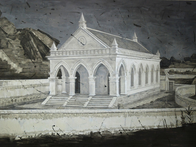 山下白色教堂,其纯洁性不惹人玷污,一堵白色矮墙将它团团困住,留住一门狭小的出口,彷佛是艺术家自己留给自己容纳人心的洗涤的圣地,告诫自己不要迷失。