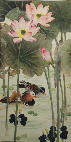 国画工笔花鸟画。荷花又称芙蓉(富贵荣华),鸳鸯戏水,百年好合。