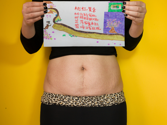 《“我们”的产痛时代!》:是一组利用第一人称视角来讲述故事的静态图片和声音结合的装置作品。本组作品一共5幅,展示了五个接受剖腹产女性的心声,也是对时下很大一部分年轻女性乐于接受剖腹产手术的这个现象的一个关注和探讨。尽管利用发达的科技手段免可以免去自然生产所承受的痛,但剖腹产手术后所留下的疤痕让这种分娩痛显得更加触目惊心。通过走访了一个县城二十位26-33岁之间分娩的的年轻女性,她们中70%得到部分允许后,访问并把她们对如何选择剖腹产以及对剖腹产手术的认识等看法用声音记录设备记录下来,以她们个人家庭为拍摄背景进行了图片记录。在展示中,每幅照片旁边会附有播放器,观众可以通过耳机听到她们的观点。她们中大多数人虽经历过手术,但同时也对这样的“不自然”的生产方式的态度有所保留。她们也希望同社会一道可以关注并探讨剖腹产是否更有利于女性深长这个问题。同时也向外界展示了她们作为时下年轻母亲对自己的子女家庭所经历的痛和付出。