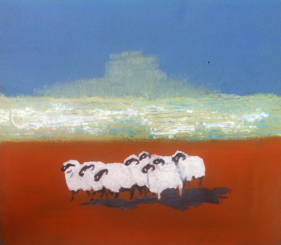 2015羊年创作的以羊群为主题的原创油画作品。跨雪山,过草原,在艰辛和漫长的旅途中,8只羊紧紧的团结在一起,不离不弃,结伴而行,向着最终的目标前行。