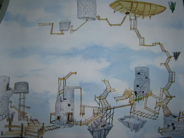 水彩泼墨绘出天空云彩,工笔绘制漂浮古城,记忆只剩下飘渺。