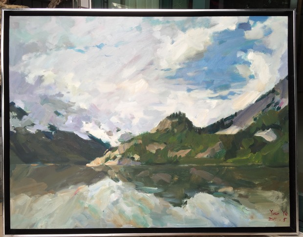 画家用潇洒的笔触和巧妙的色块搭配为观者展现了祖国壮丽的山水。云彩丰富的变化并没有影响视觉中心,而是更好的突出了山体和倒影。带有纵深感的构图,黄金分割的山水和天空更是为此画增加了不少美学价值,使人眼前一亮。