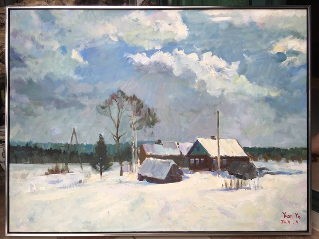 这张画面中画家使用大量的白,熟练的色彩运用使这些白不重复单调,在细微的变化中营造了宁静的气氛,使观众烦躁的心情安定下来。让视觉集中的构图方式,使面积较大的天空和雪地不但不会抢夺了视觉中心点,反而很好地映衬着主题。一幅优美的宁静的乡村小景展现在我们眼前,仿佛身临其境一般。
