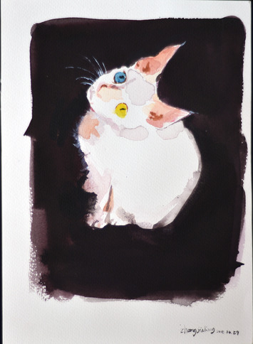 家里养的一只猫生病去世了,创作了这幅水彩《猫—可可》。之后在网上看到了一组猫的照片,随即又创作了一系列以“猫”为主题的作品。