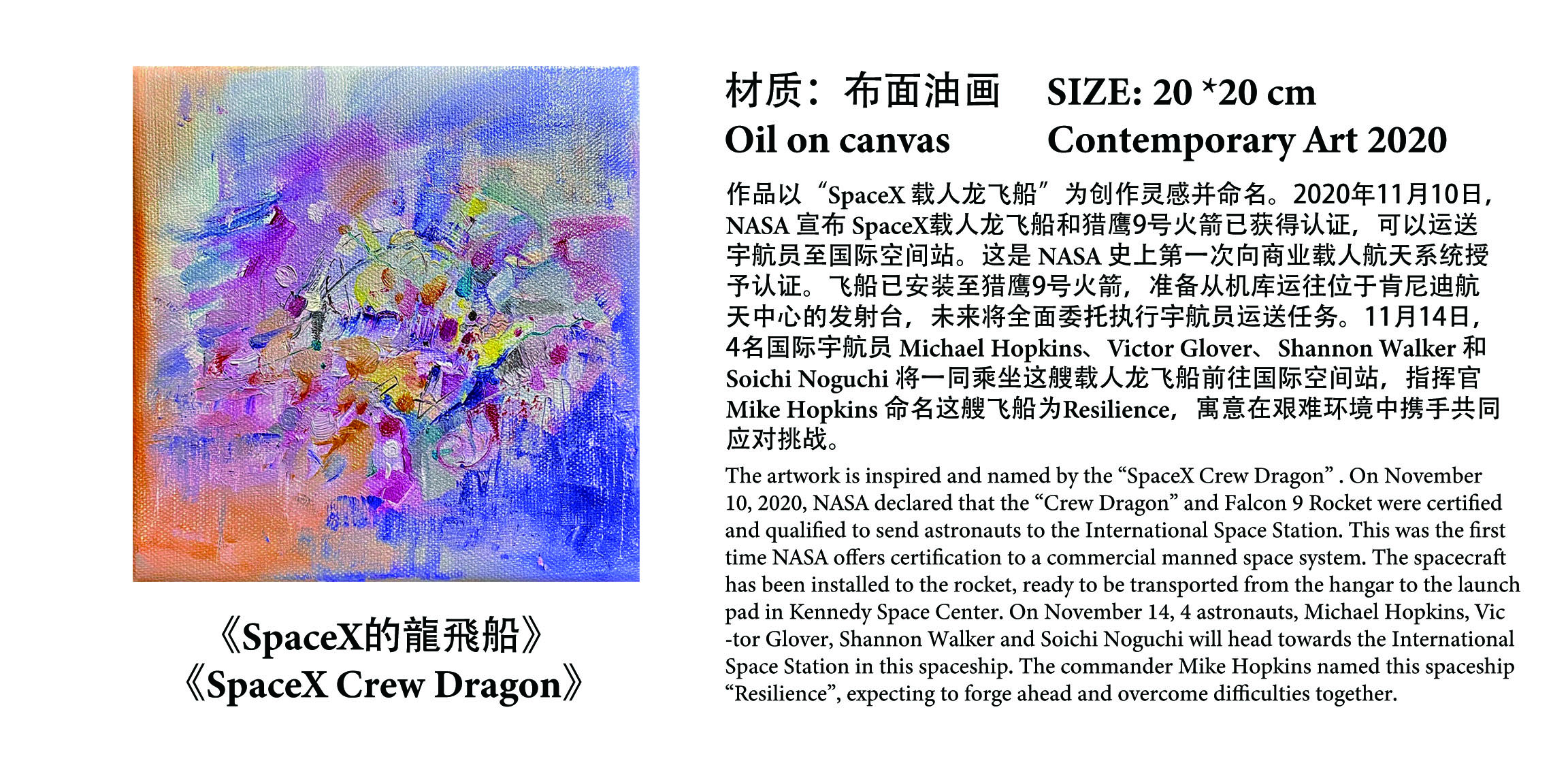 作品以“SpaceX 载人龙飞船”为创作灵感并命名。2020年11月10日,NASA 宣布 SpaceX载人龙飞船和猎鹰9号火箭已获得认证,可以运送宇航员至国际空间站。这是 NASA 史上第一次向商业载人航天系统授予认证。飞船已安装至猎鹰9号火箭,准备从机库运往位于肯尼迪航天中心的发射台,未来将全面委托执行宇航员运送任务。11月14日,4名国际宇航员 Michael Hopkins、Victor Glover、Shannon Walker 和Soichi Noguchi 将一同乘坐这艘载人龙飞船前往国际空间站,指挥官 Mike Hopkins 命名这艘飞船为「Resilience」,寓意在艰难环境中携手共同应对挑战。 The artwork is inspired and named by the “SpaceX Crew Dragon” manned spaceship. On November 10, 2020, NASA declared that the “Crew Dragon” and Falcon 9 Rocket were certified and qualified to send astronauts to the International Space Station. This was the first time NASA offers certification to a commercial manned space system. The spacecraft has been installed to the rocket, ready to be transported from the hangar to the launch pad in Kennedy Space Center. On November 14, 4 astronauts, Michael Hopkins, Victor Glover, Shannon Walker and Soichi Noguchi will head towards the International Space Station in this spaceship. The commander Mike Hopkins named this spaceship “Resilience”, expecting to forge ahead and overcome difficulties together.