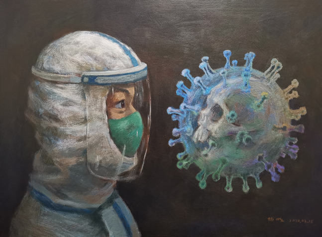 《对峙》创作理念:你们是面对面的在和病毒作斗争,不是你死就是我活。你们为了更多人的生命安危和家庭幸福义无反顾的冲在了和病毒作斗争的最前列。谢谢我们可爱可敬的白衣天使们。