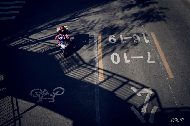在柳叶的倒影下,满载货物的助动车,戴着口罩头盔的人,为生活而忙碌