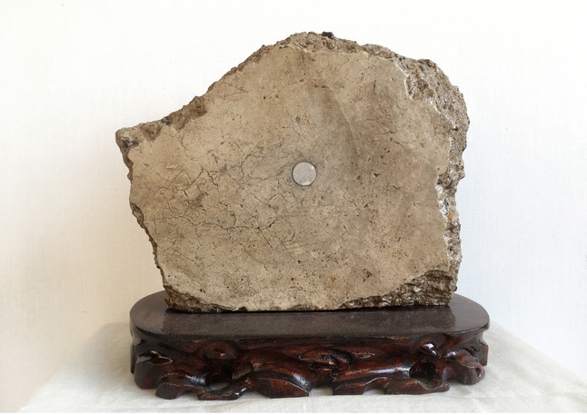 自述:我在马路上捡到一枚1982年版的一分钱硬币,我将其打磨平并镶嵌到一块因修路而废弃的混凝土块上,这枚硬币和我同龄,混凝土块假装成了一块奇石,这是自传式的时间性和历史性观赏。