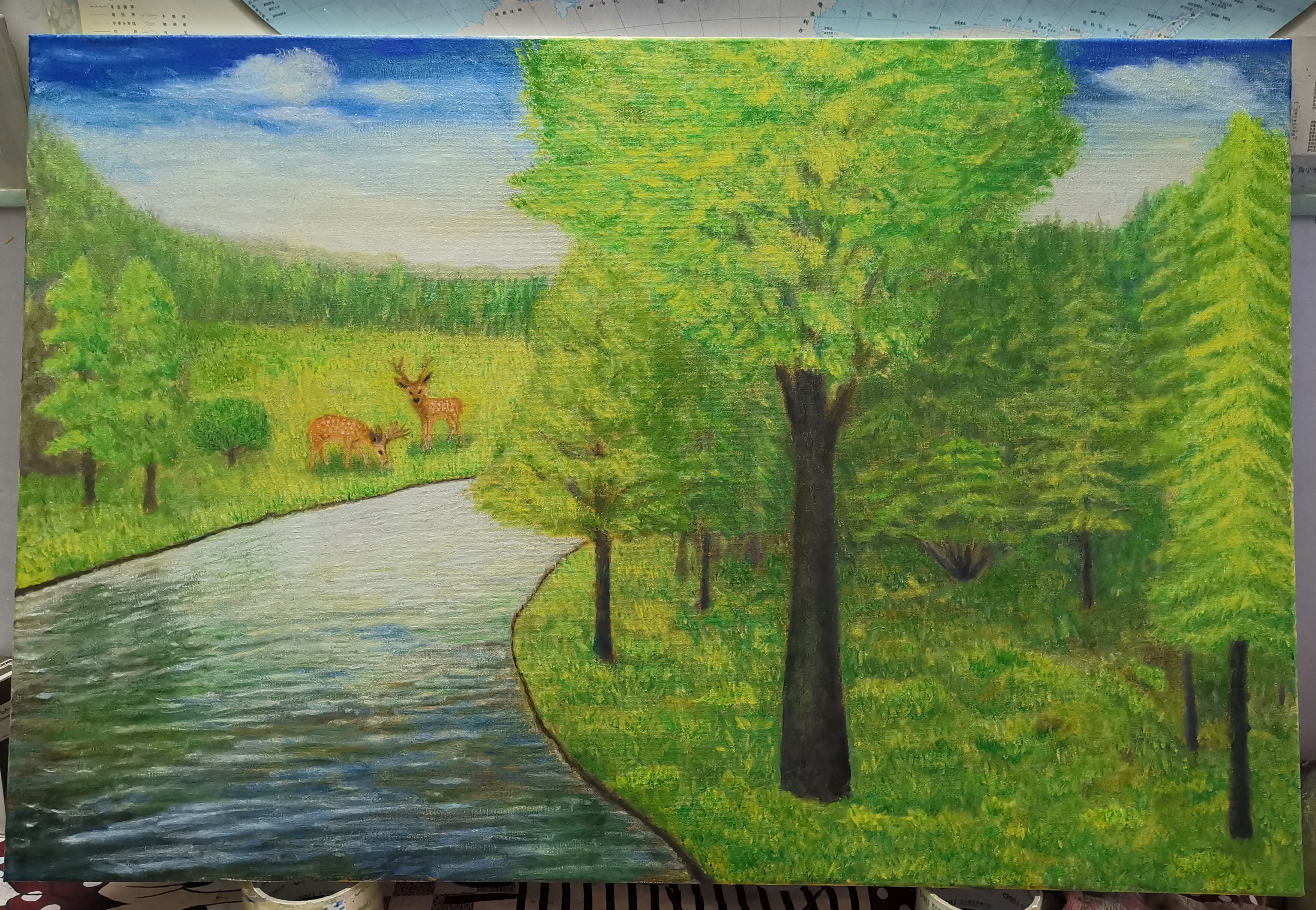 愿我的原创绘画给您带来愉悦健康和思想!鹿在中国是吉祥物,鹿与禄同音,福禄寿是人们的美好愿望!鹿只有生活在空气新鲜,水质优良,植被丰富的环境中才能称为福鹿!此画是按中国古代风水学原理和美学原理以及养生学原理创作的,有一定的养生健身作用,常看此画可使人心情愉悦健康长寿!本人长年定制油画风景油画肖像,价格可商议,画的效果为古典风格,是理想中的美,希望您喜欢!欢迎惠顾!